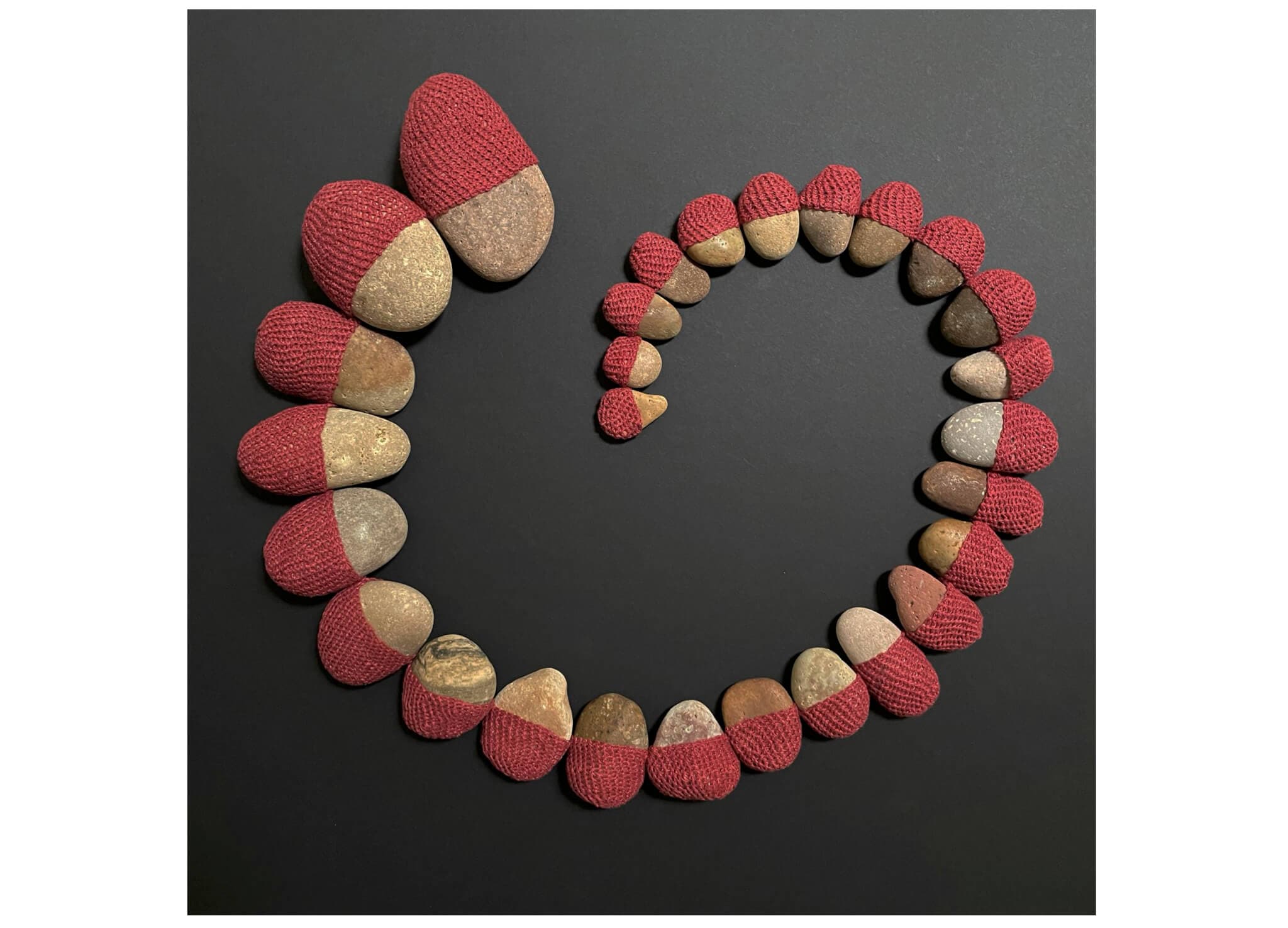 Sarah Haskell, Hold Me Like a Mother: Red, 2023. Maine beach stones, linen dyed with madder and cochineal, and crochet. Dimensions variable. Courtesy of the artist.